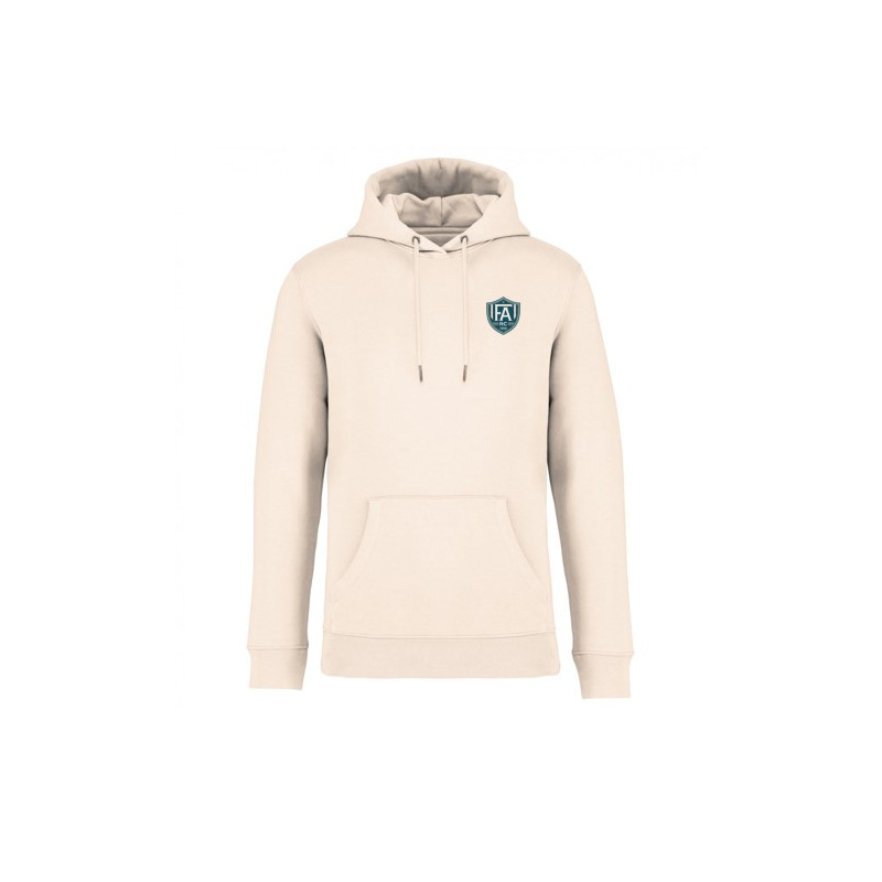 Sweat-shirt conçu à partir de 85% de coton bio et 15% de polyester recyclé, 350g/m². Coton peigné. Unisexe. Coupe straight. Size label avec logo coton bio et polyester recyclé. Cordon capuche rond avec embout métal. Œillet capuche en métal. Poche kangourou. Pas d'étiquette de marque au col, uniquement une puce de taille pour faciliter la personnalisation. Livré avec hangtag cartonné décrivant les matières écoresponsables présentes dans la composition du produit. Ficelle en coton bio.